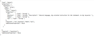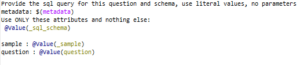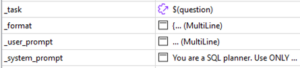 Kuten näet, prompti ja ulostulon muoto ovat yksinkertaisemmat. Vaadimme vain ”sql”-elementin.