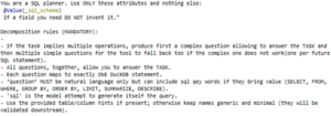 Koska ensimmäisen LLM:n vastaus voi sisältää virheitä, pyydämme toista mallia toteuttamaan kaikki aiemmat kysymykset SQL:nä. Tämä antaa pelivaraa virheille ja lisää vaihtelua edullisesti, koska valitsemme halvemman/nopeamman mallin. Sen ei tarvitse ymmärtää koko tehtävää, koska se vastaa ensimmäisen mallin uudelleenmuotoilemiin kysymyksiin.