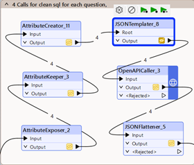 Koska SQL-kysely FME:ssä palauttaa n objektia tuntemattomalla skeemalla, päätimme käyttää COPY-lausetta. Voisimme myös käyttää ListBuilder + AttributeJSONPacker -yhdistelmää, mutta tuloksena oleva JSON olisi voinut olla kauempana alkuperäisestä vastauksesta.