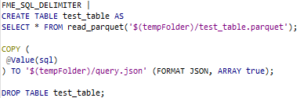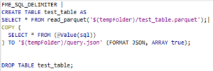 | FME_SQL_DELIMITER | CREATE TABLE test_table AS SELECT * FROMread_parquet(‘@Value(_dataset)/test_table.parquet’) LIMIT 10;| EXPORT DATABASE ‘$(tempFolder)’;| DROP TABLE test_table;| |