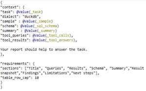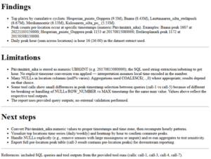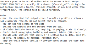 Yhtä tärkeää kuin tulos on kurinalaisuus sen takana: vain pieniä, merkityksellisiä tietoviipaleita (skeema, yhteenvetotilastot, esimerkkirivit) lähetettiin malleille; laitoimme kaiteet SQL-suorituksen ympärille (COPY (SELECT …), puolipisteen poisto, tulosrajoitukset); ja ohjasimme analyytikkovaiheen päättelemään nimetyistä tulosjoukoista eikä raakadata-tauluista. Näin LLM:t pysyvät omalla tontillaan ja varsinainen datatyö siellä missä sen kuuluukin olla.