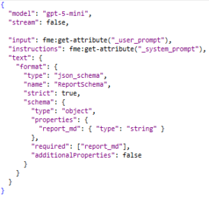 Kun olemme koonneet kaiken tarvittavan, FME loistaa sen uudelleenjäsentelyssä LLM-analyysiä varten. Teksti- ja JSON-transformereiden yhdistelmällä voi rakentaa minkä tahansa mallisen promptin.