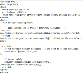 Tätä varten meillä on HTML-attribuutti, jossa on placeholder markdown-elementille — sijoitamme raportin siihen.