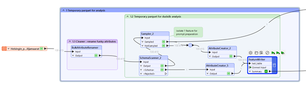 Mitä saat: Uudelleenkäytettävä FME-työtila, joka muuntaa minkä tahansa taulukkomuotoisen syötteen Parquet-muotoon, poimii skeeman/tiivistelmän/otoksen, suunnittelee kysymykset, ajaa SQL:t ja tuottaa markdownista HTML-analyysin.
