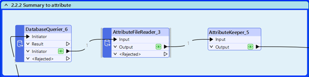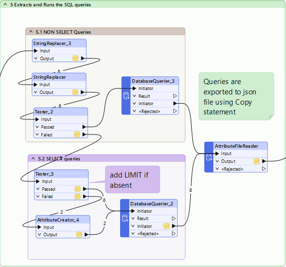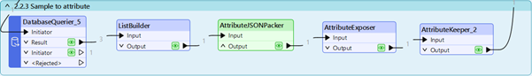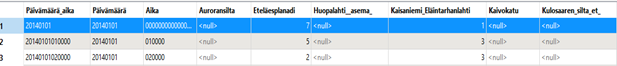 Koska SQL-kysely FME:ssä palauttaa n objektia tuntemattomalla skeemalla, päätimme käyttää COPY-lausetta. Voisimme myös käyttää ListBuilder + AttributeJSONPacker -yhdistelmää, mutta tuloksena oleva JSON olisi voinut olla kauempana alkuperäisestä vastauksesta.