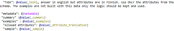 Tässä tulee hieman enemmän JSONia ja kokeilua. Meidän pitää rakentaa ohjeistus, joka yhdistää uudet tiedot ja kysymyksemme niin, että malli vastaa odotetulla tavalla.