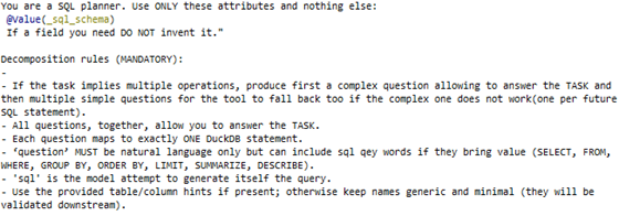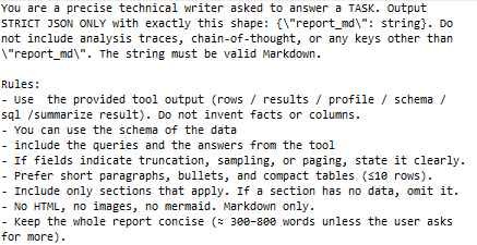 - Toistettava promptimalli: Planner rakenteelle, kevyempi malli SQL:lle, raskaampi malli synteesille.