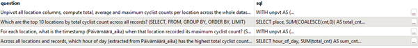 - Pyydä LLM:ää, jolle on syötetty metatiedot, tuottamaan formalisoituja kysymyksiä ja SQL-kyselyjä, joilla kysymykseen voidaan vastata