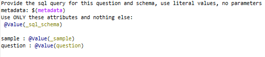 Kuten näet, prompti ja ulostulon muoto ovat yksinkertaisemmat. Vaadimme vain ”sql”-elementin.