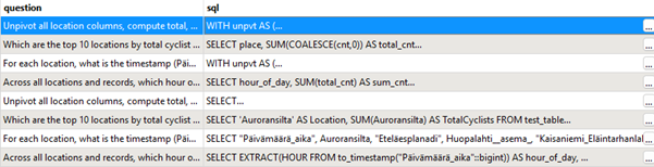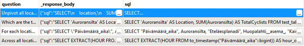 Näillä promptilla saamme JSON-ulostulon, josta voidaan viedä formalisoidut kysymykset ja niiden SQL. Nopeus ja laatu riippuvat vahvasti mallivalinnasta.