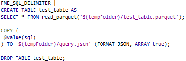 | FME_SQL_DELIMITER | CREATE TABLE test_table AS SELECT * FROMread_parquet(‘@Value(_dataset)/test_table.parquet’) LIMIT 10;| EXPORT DATABASE ‘$(tempFolder)’;| DROP TABLE test_table;| |