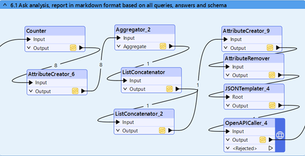 Kun olemme koonneet kaiken tarvittavan, FME loistaa sen uudelleenjäsentelyssä LLM-analyysiä varten. Teksti- ja JSON-transformereiden yhdistelmällä voi rakentaa minkä tahansa mallisen promptin.