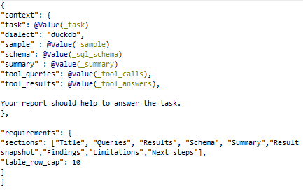 Kuten näet, mikään ei ole aineistokohtaista — ainoastaan säännöt. Valitsimme Markdownin, koska se on kevyt tokeneiden kannalta mutta riittävän ilmaisukykyinen rakenteeseen. Mikään ei estä tiivistämästä, kääntämästä tai kaunistamasta raporttia myöhemmin edullisemmilla malleilla.