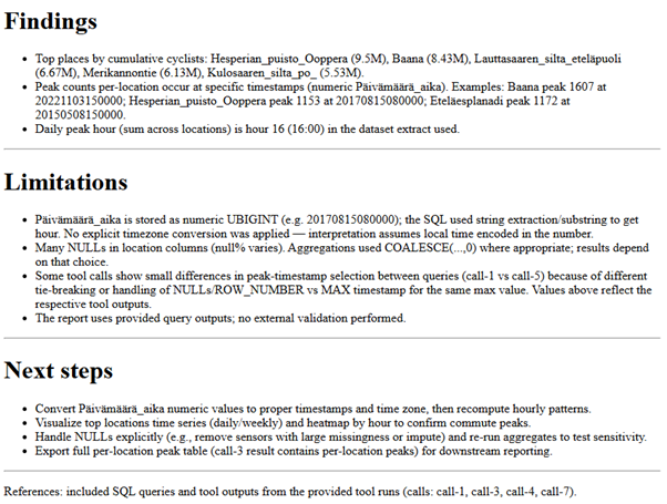 Erottamalla ingestoinnin, profiloinnin, suunnittelun, kyselyn, analyysin ja raportoinnin pystyimme muuttamaan sekavan, suomenkielisen Excel-taulukon selkeiksi vastauksiksi Helsingin pyöräilykuvioista ilman käsin kirjoitettuja SQL-lauseita. FME hoiti orkestroinnin ja formaattien käsittelyn, DuckDB tarjosi nopean, paikallisen SQL:n Parquetin päälle, ja kolme fokusoitua LLM-roolia (Planner → SQL Generator → Analyst) pitivät työnkulun luotettavana ja kustannustietoisena.